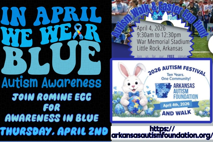 🫐April is Autism Awareness month. This Thursday, APRIL 2nd is National Autism Awareness Day and Romine ECC would love for everyone to join us in wearing the color Blue in support. 🦋💙🧢🚙🦕🔵👕🔹🌀🔷🎽📘🟦🪣🖲️🩵🫐🥿 🥿 Also, this coming Saturday, APRIL 4th is the 2026 Autism Festival with a walk & Easter Egg Hunt starting at 9:30 AM at War Memorial Stadium. Register at: arkansasautismfoundation.org